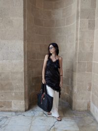 חליפת אלכסה מבד פוטר נעים כל הגוף מגיעה שני חלקים טופ קצר שרוולים בסגנון "אעטלף" וחצאית מידי עם חגורה במותן .